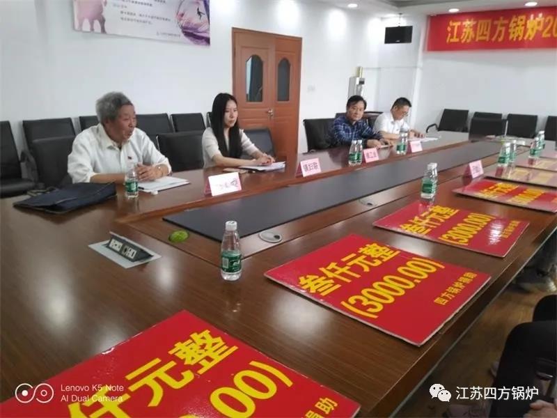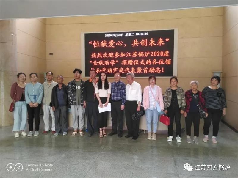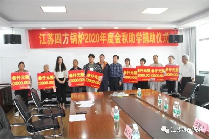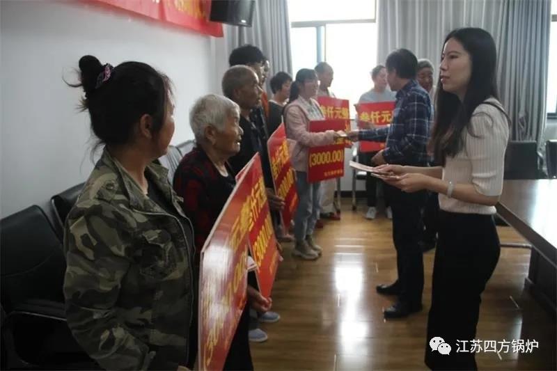 儀式最后,發放江蘇四方鍋爐“金秋助學”助學金。與會領導一同向10名受助貧困學生或家庭代表,每人發給了3000元助學金,并合影留念,以此勵志篤行。